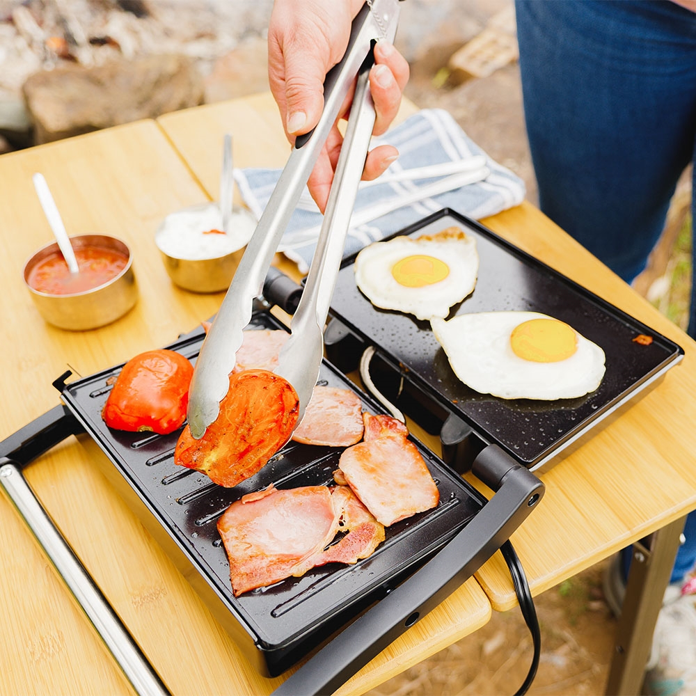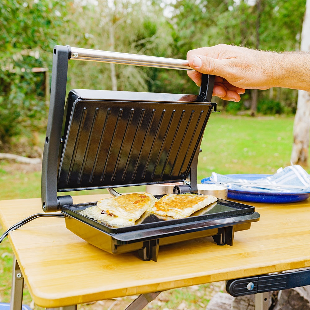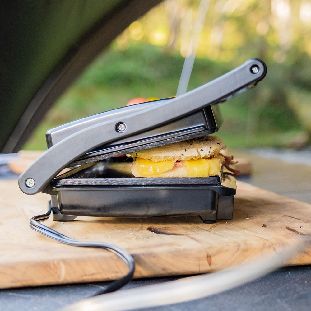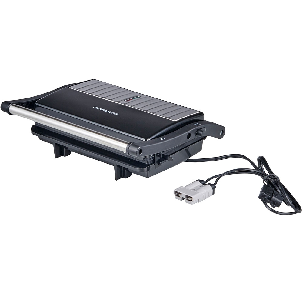 Perfect for cooking around the campsite, the worksite or enjoying hot meals on the go, the Companion Roam Sandwich Grill Press transforms from a sandwich press to a grill plate in seconds, thanks to its 180-degree folding design. Whether you're making toasties or whipping up breakfast, the grill and flat plate combo supports a variety of cooking styles. Dual heating elements ensure even heat distribution across both plates. Cleanup is simple with non-stick cooking surfaces and a built-in oil barrier. The cool-touch handle adds safety while cooking, and the built-in power lights let you know when its ready. Best of all, it's safe to use during total fire bans - no open flames, just reliable hot meals wherever you are. Plus, with an Anderson-style connector, you can hook it up to a battery box and enjoy hot snacks wherever your adventure takes you.