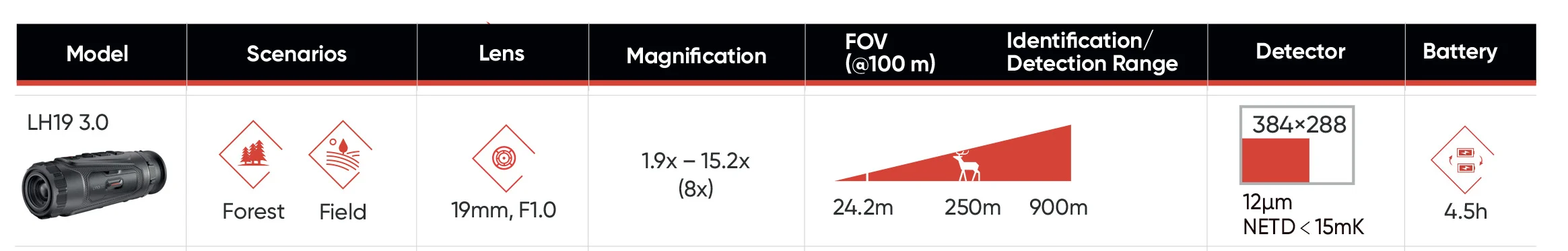 It’s wide 13.8° field of view (24.2m at 100m) and extended 900-metre detection range make it an excellent choice for wildlife observation, bush scanning, pest control, and long-range spotting. Compact, lightweight, and equipped with advanced shutterless technology, the LH19 3.0 is perfect for hunters and outdoor professionals seeking a powerful yet portable thermal spotter.