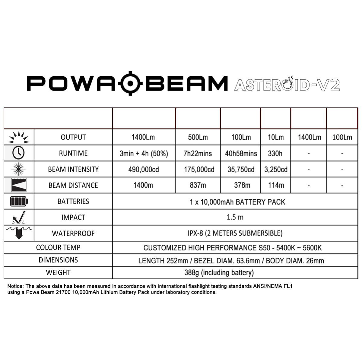 Powa Beam Asteroid-V2 has a super long beam distance of 1400m and a max output of 1400lm. The Asteroid has a 10,000mAh battery pack and is rechargeable via a USB-C fast charge cable.
