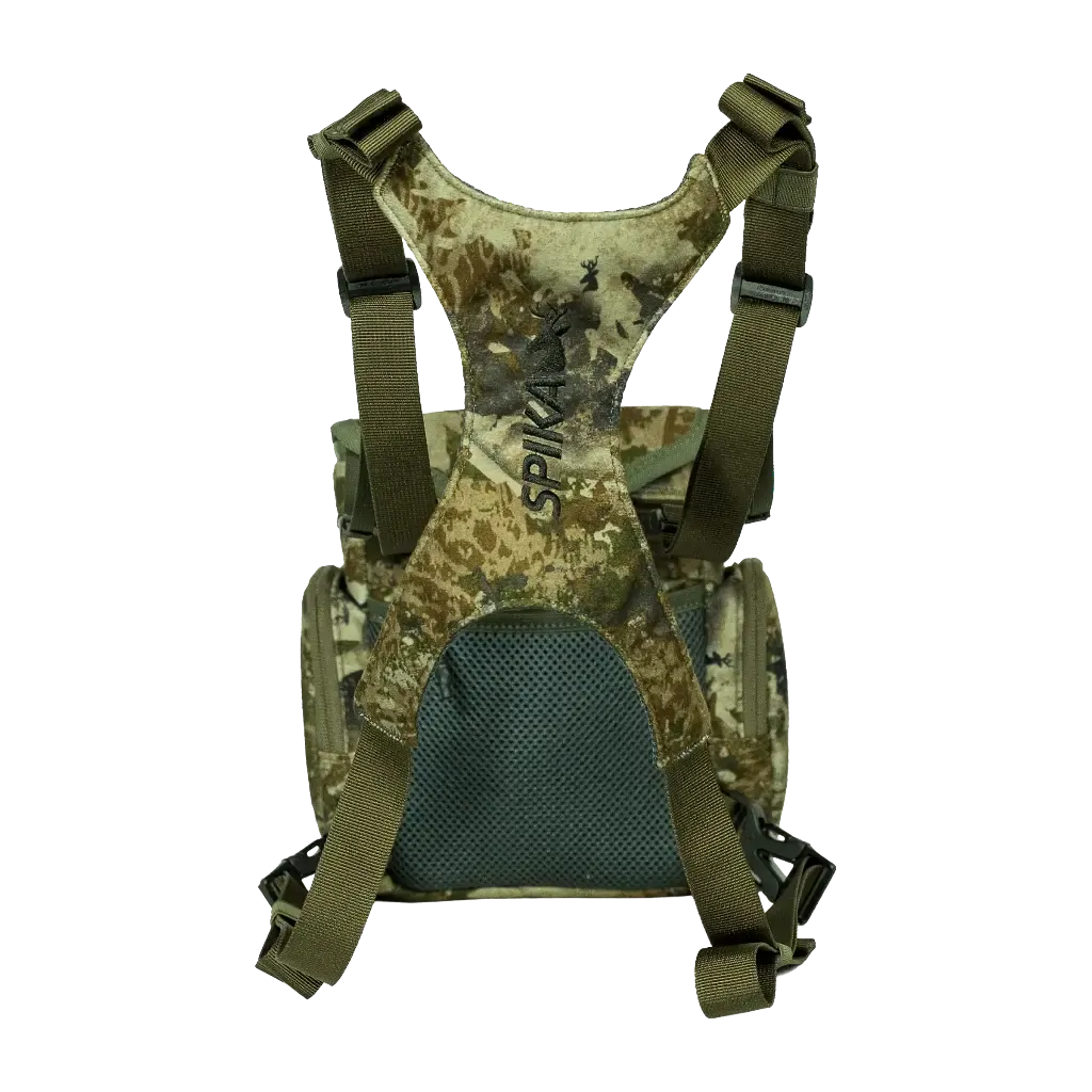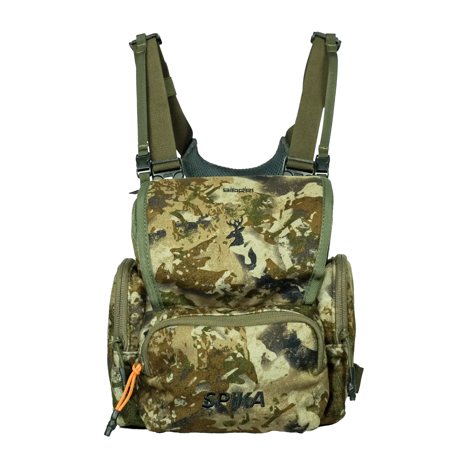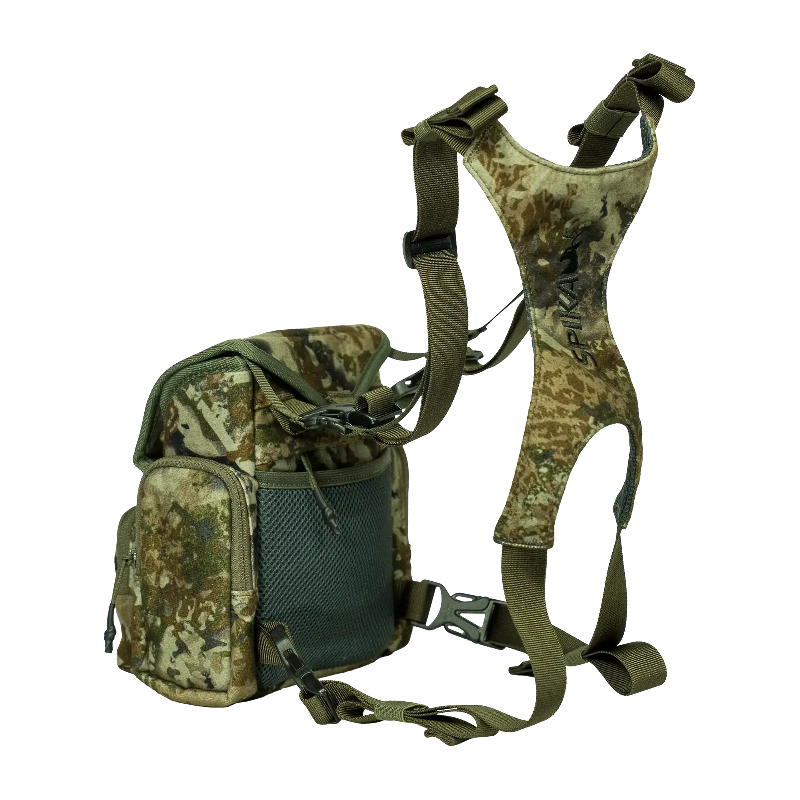 The Spika Drover II Bino Harness is ideal for serious spot-and-stalk hunter and is designed for comfort, accessibility and functionality. The main compartment protects your binoculars and the magnetised lid and safety straps keep your optics secure. Carry your essential gear in convenience with a spacious front pocket that features ammo storage and 2 side pockets perfect for smaller tools and devices like range finders or GPS units. No matter your hunting style the four-point body harness provides a stable and comfortable position for your essential gear. To protect your optics and other gear from the elements the Drover II Bino Pack includes a blaze orange rain cover.