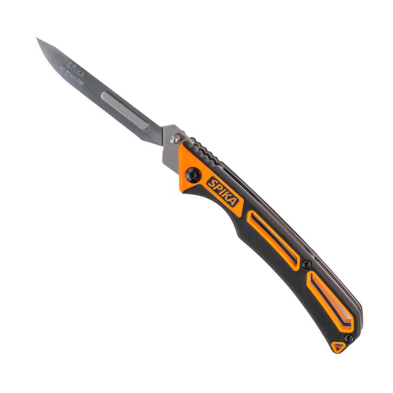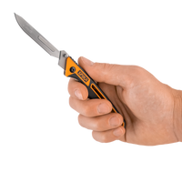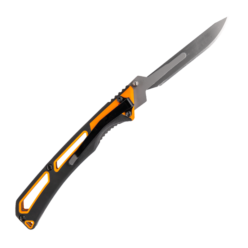 The Command Folding Scalpel KRSP-SC04B is a precision tool built for hunters and outdoor enthusiasts who demand razor-sharp performance. Designed for maximum utility in the field, this heavy-duty folding scalpel ensures precision cuts, whether you're skinning game or handling other detailed tasks. It features a rubberized grip for a secure hold, even in wet or cold conditions, and includes thumb studs for easy, one-handed blade deployment. Equipped with five replacement blades, this scalpel is ready for extended use, so you'll never be without a sharp edge. The reliable belt clip keeps it within reach, making it an indispensable tool for efficient field dressing.