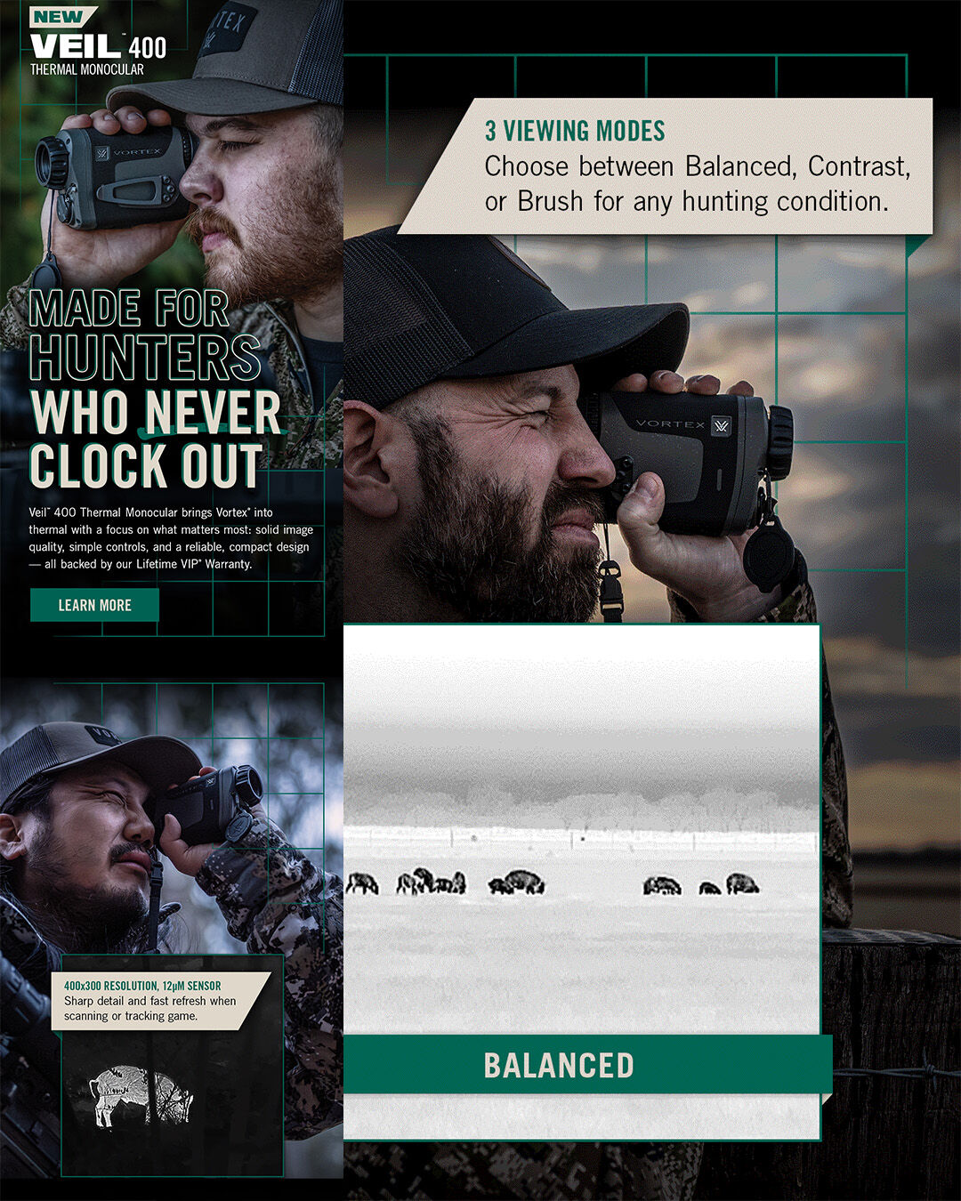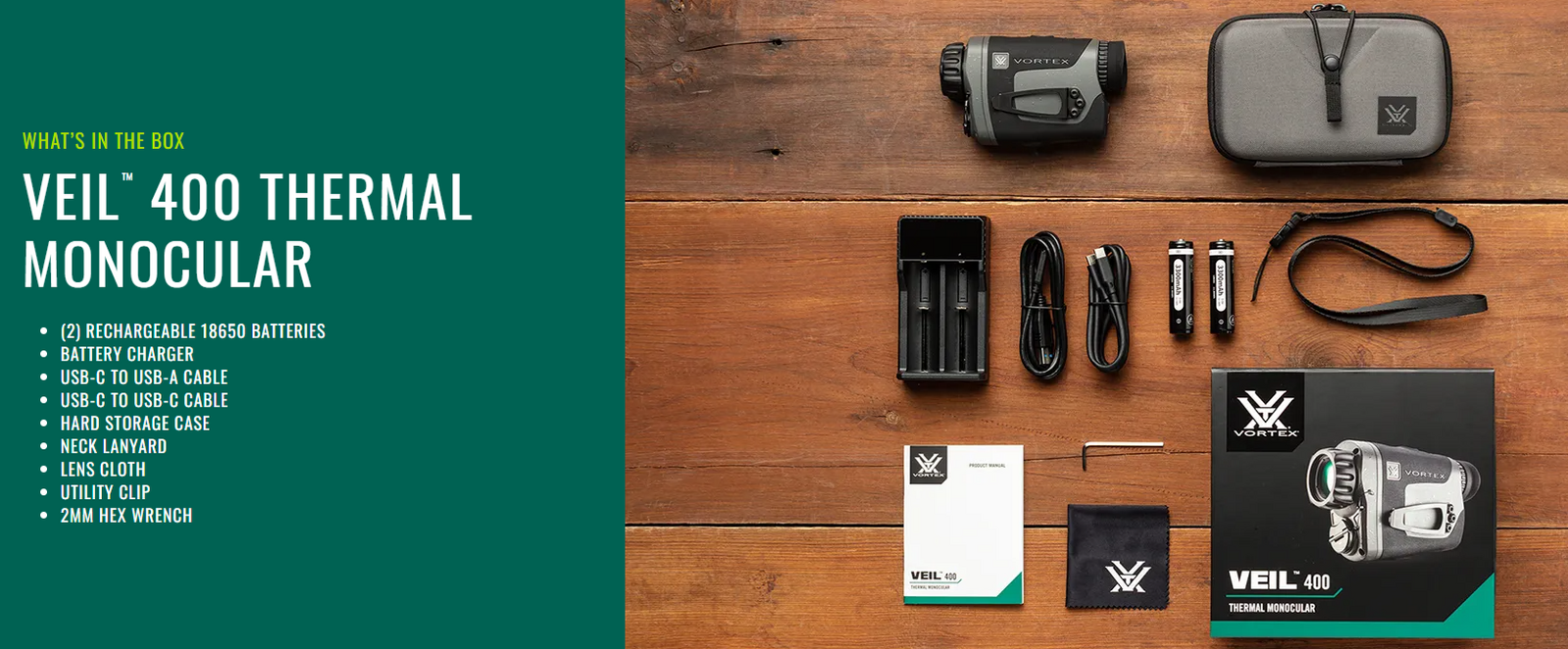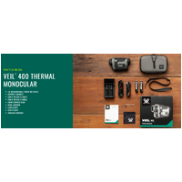 The Vortex Veil 400 is a compact thermal monocular designed for predator hunting and low-light navigation. It features a 400x300 sensor resolution with a 12µm pixel pitch and a 50Hz refresh rate, providing smooth, detailed imagery for detecting heat signatures up to 1000m.